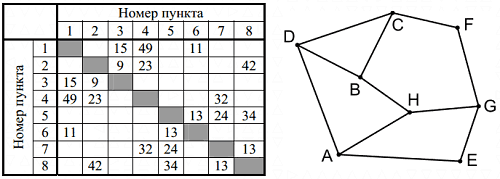 Так как таблицу и схему рисовали независимо друг от друга, нумерация населённых пунктов в таблице никак не связана с буквенными обозначениями на графе. Определите, какова сумма протяжённостей дорог из пункта С в пункт В и из пункта А в пункт Н.