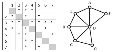 На рисунке справа схема дорог Н-ского района изображена в виде графа, звёздочка в ячейке таблицы обозначает наличие дороги между двумя пунктами. Так как таблицу и схему рисовали независимо друг от друга, то нумерация населённых пунктов в таблице никак не связана с буквенными обозначениями на графе.